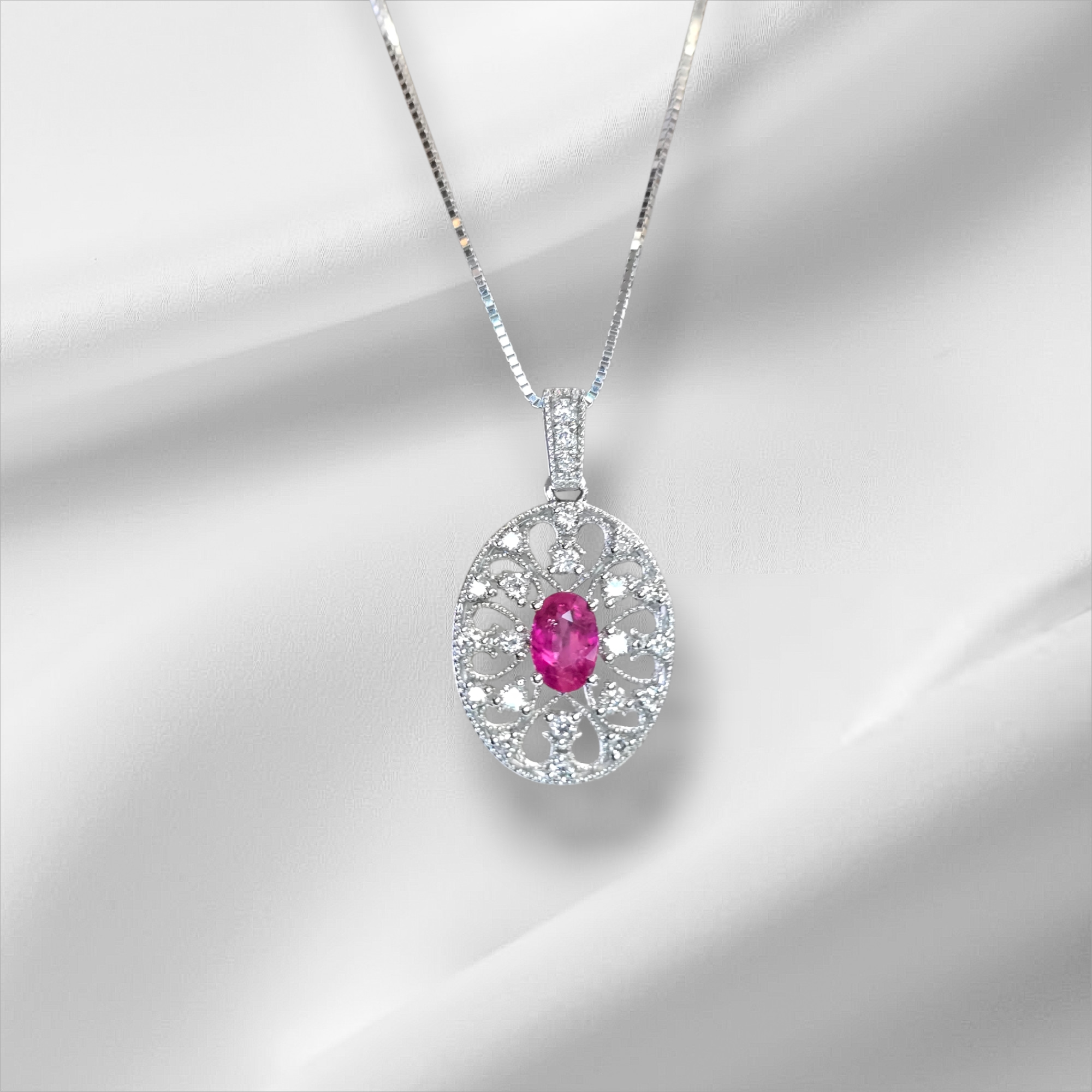 14k White Gold Oval Ruby and Diamond Filagree Pendant with Box Chain