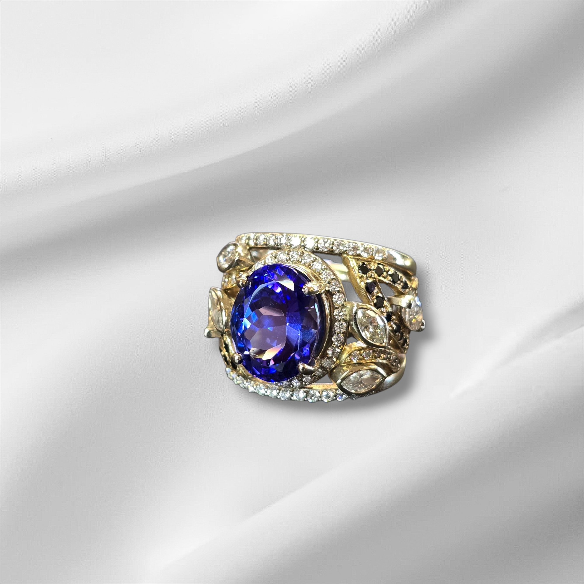 14K Two Tone Oval Tanzanite Cocktail Ring with Black and White Diamonds
