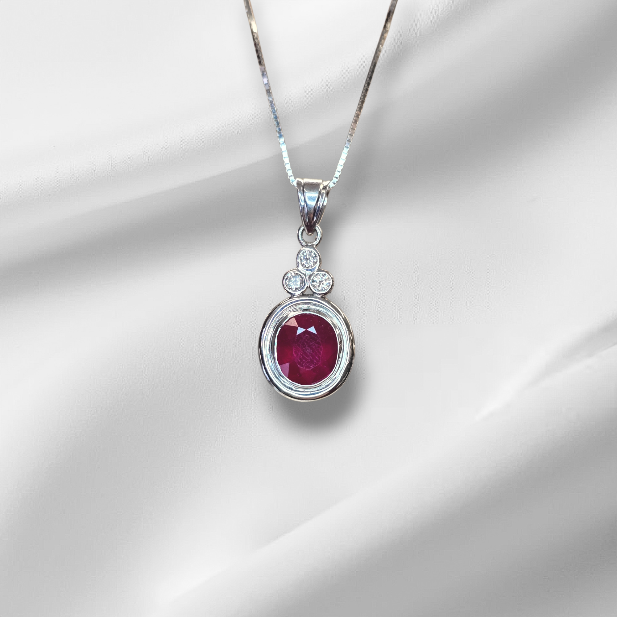 18K White Gold Pendant with Oval Ruby and 3 Diamond Accent