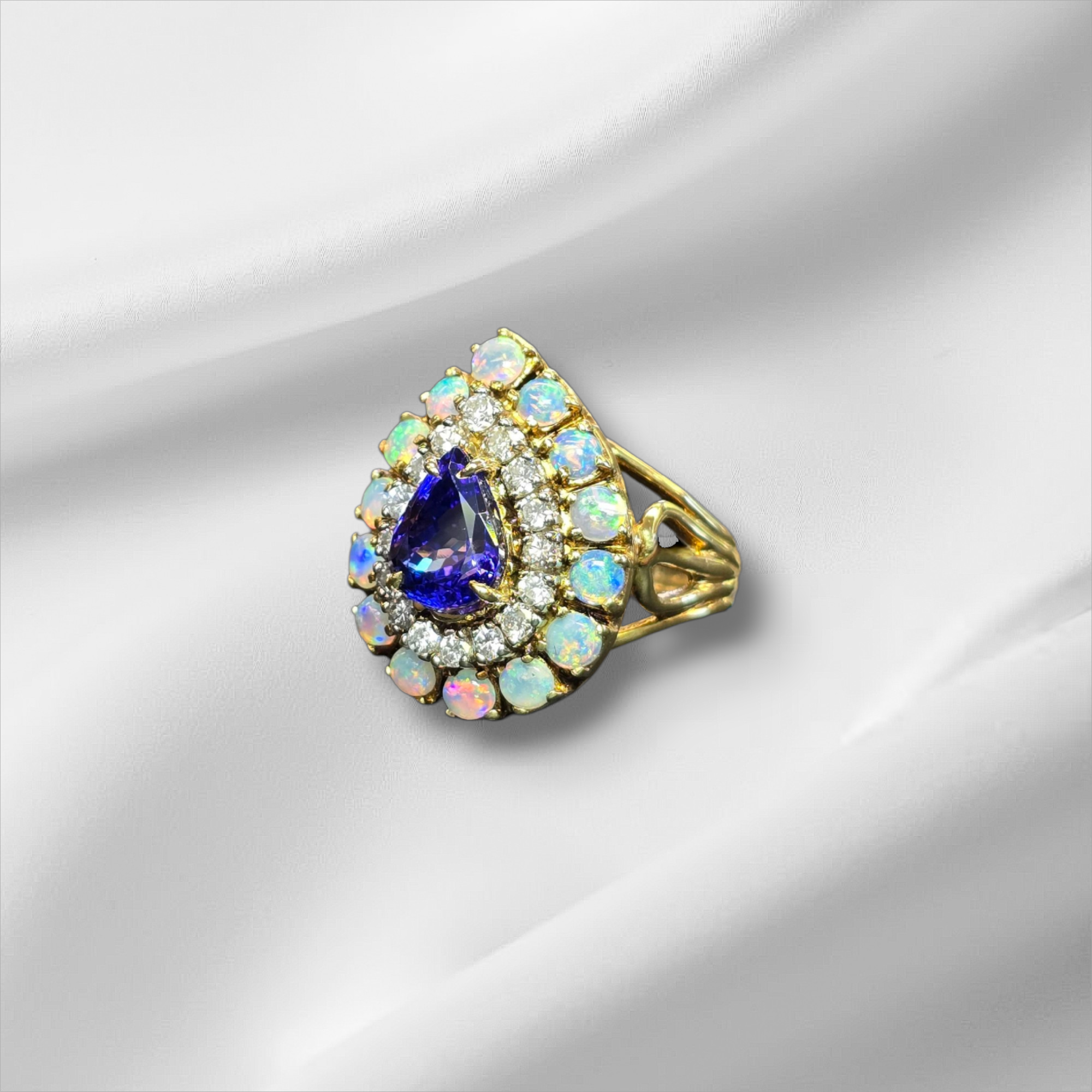 18K Yellow Gold Pear Shape Tanzanite Ring with Diamond and Casbah Opal Double Halo