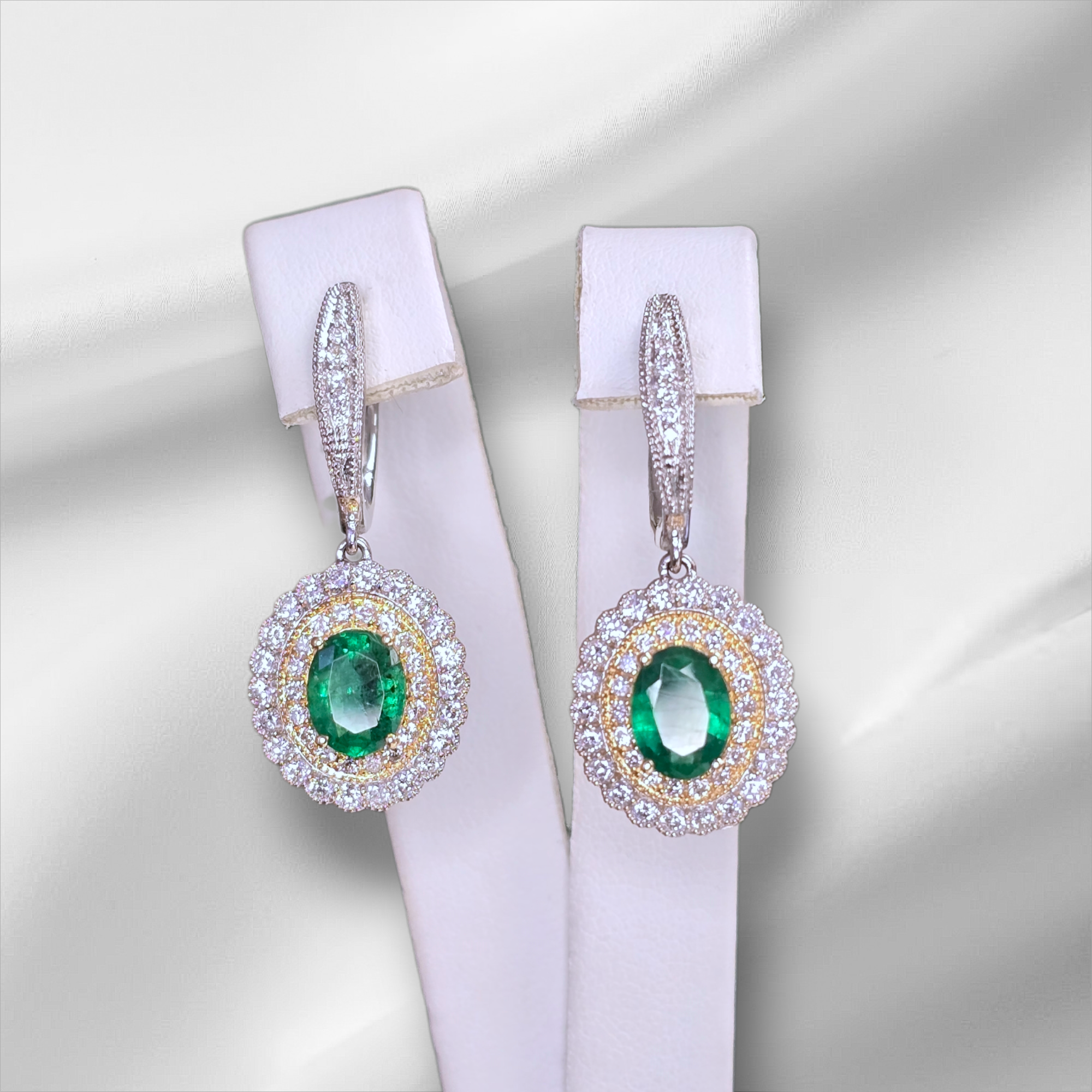 14K Two Tone Oval Emerald Dangle Earrings with Double Halo.