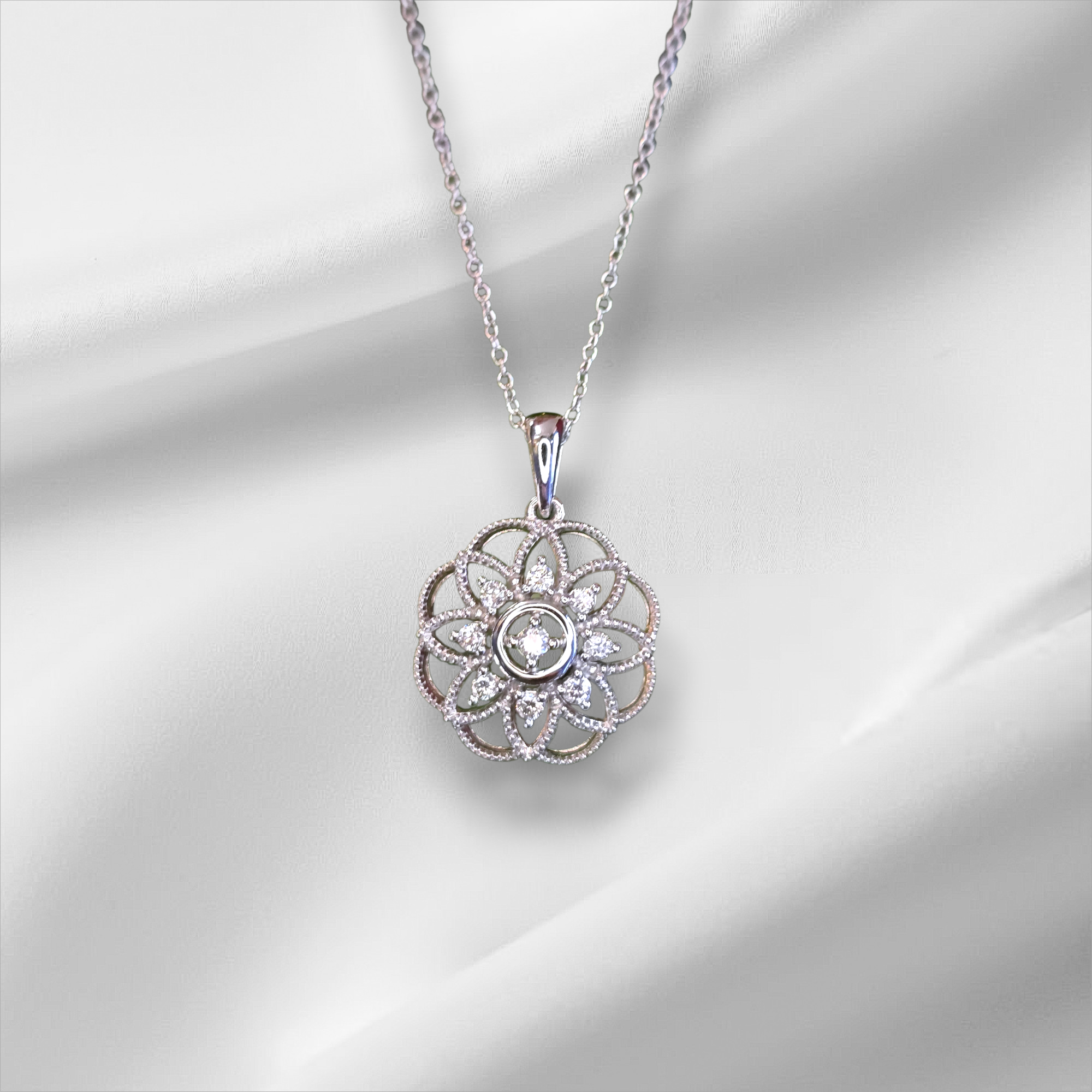 14K White Gold Vintage Inspired Floral Pedant with Diamonds and Adjustable Chain