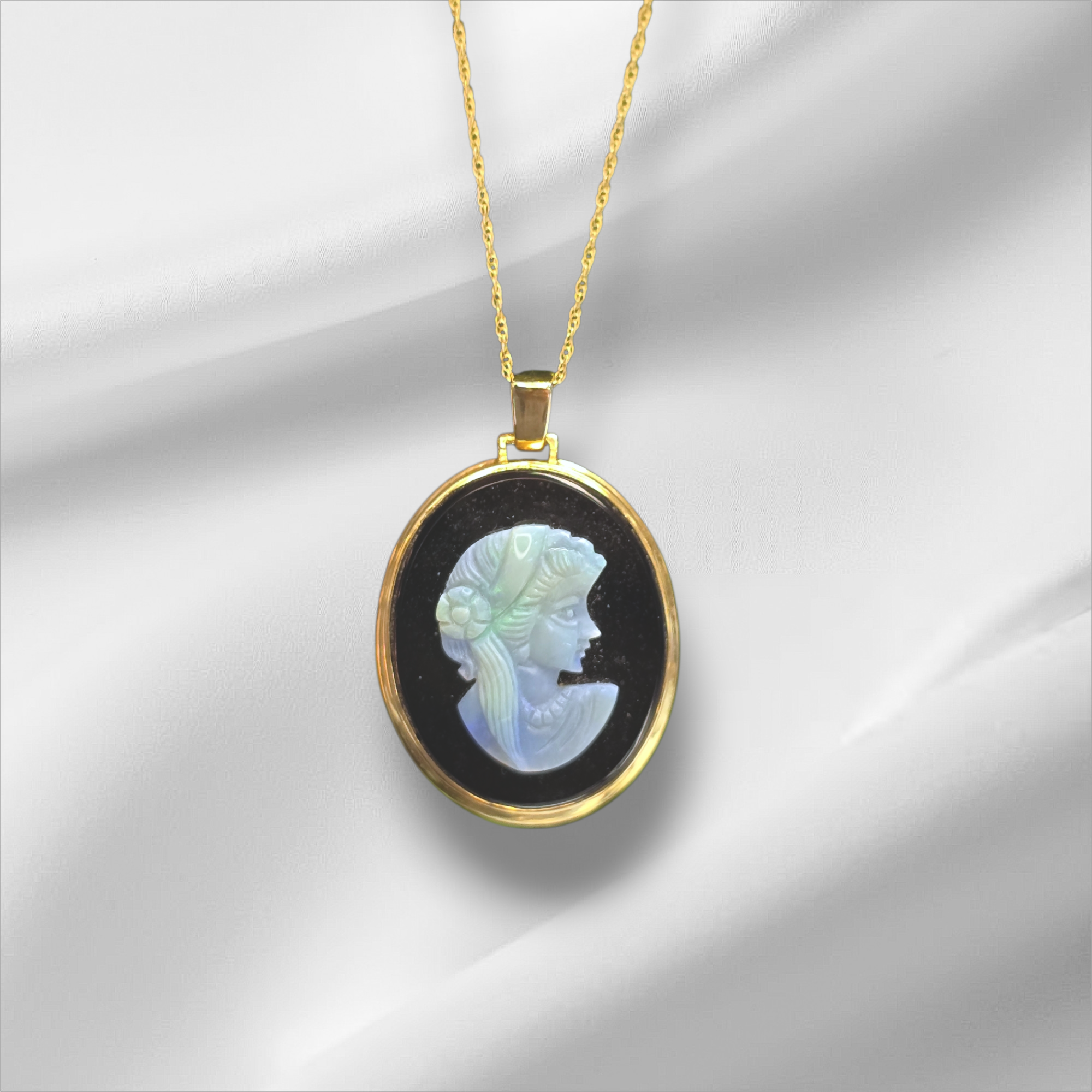 14K Yellow Gold Vintage Onyx with Opal Cameo Pendant with 18″ Promo Chain